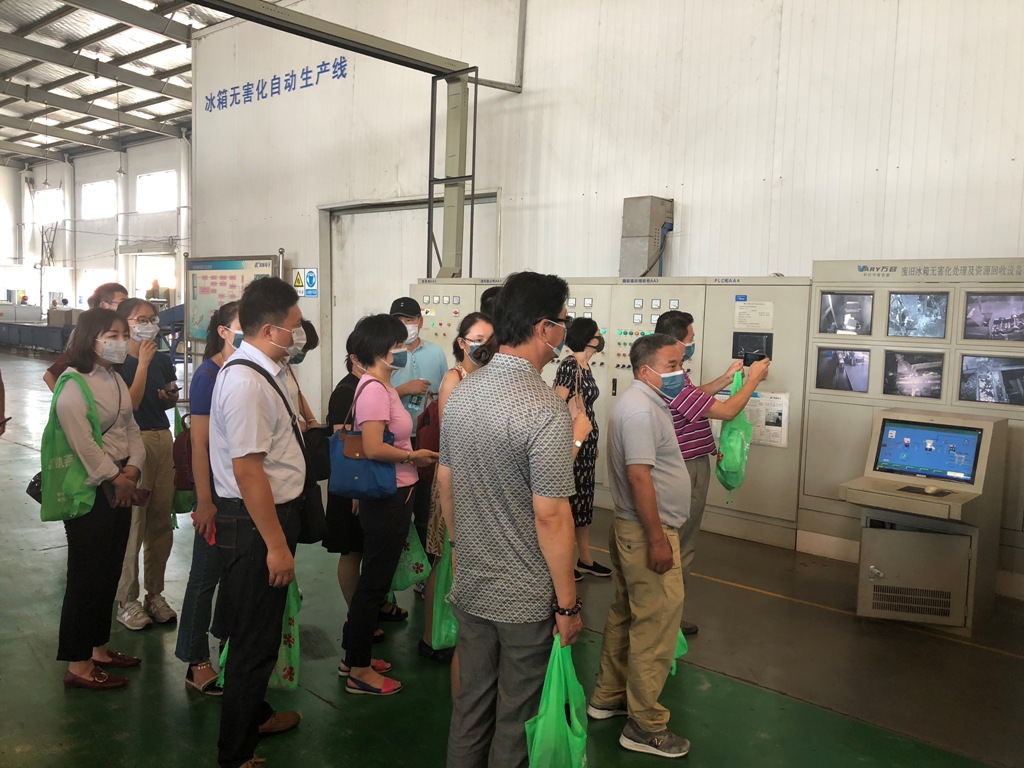 調(diào)研組對(duì)“e環(huán)保.易回收”互聯(lián)網(wǎng)+回收廢舊家電情況進(jìn)行了詳細(xì)了解。隨后參觀了監(jiān)控室,對(duì)公司環(huán)保基金視頻監(jiān)控做到省市區(qū)三位一體,24小時(shí)監(jiān)控?zé)o死角表示贊揚(yáng)。在冰箱線(xiàn)拆解車(chē)間,調(diào)研組領(lǐng)導(dǎo)詳細(xì)聽(tīng)取了我公司廢舊冰箱自動(dòng)拆解線(xiàn)工藝流程,整套流程由十個(gè)系統(tǒng)組成:抽氟設(shè)備(聯(lián)合國(guó)多邊基金贊助)、破碎系統(tǒng)、粉碎系統(tǒng)、風(fēng)選系統(tǒng)、除鐵系統(tǒng)、有色金屬分離系統(tǒng)、泡沫減容無(wú)害回收系統(tǒng)、粉塵及尾氣處理系統(tǒng)、安全系統(tǒng)、自動(dòng)控制系統(tǒng)。整個(gè)過(guò)程有封閉集塵系統(tǒng)收集破碎之產(chǎn)生的粉塵,并經(jīng)過(guò)活性碳吸附后15米高管道排放。達(dá)到省市環(huán)保的零排放、零污染的環(huán)保廢氣排放標(biāo)準(zhǔn)。